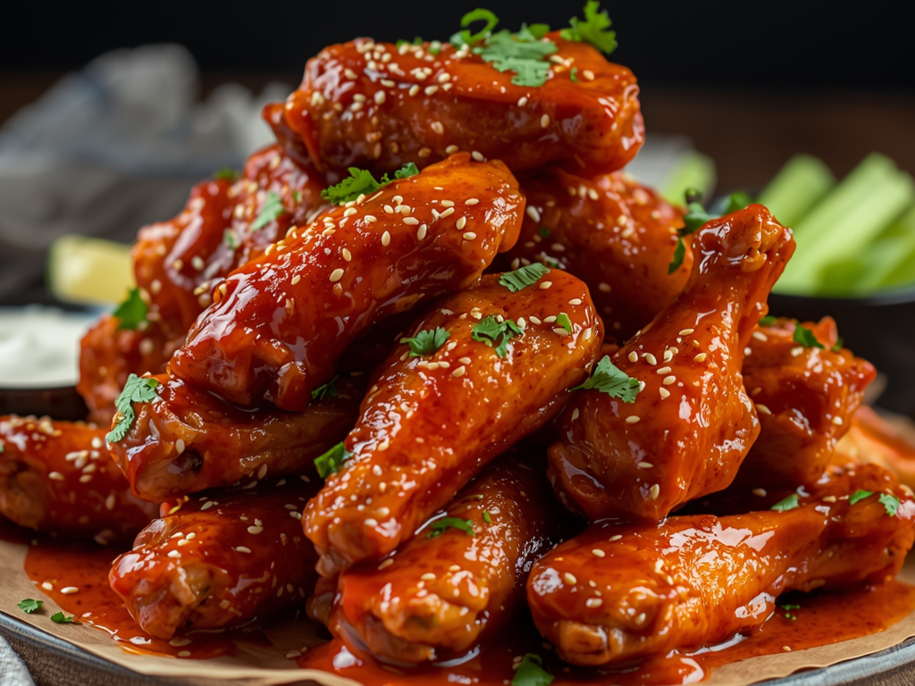 6. Serve: Arrange the wings on a platter. Garnish with sesame seeds and chopped cilantro. Serve immediately with cooling ranch or blue cheese dip if desired.