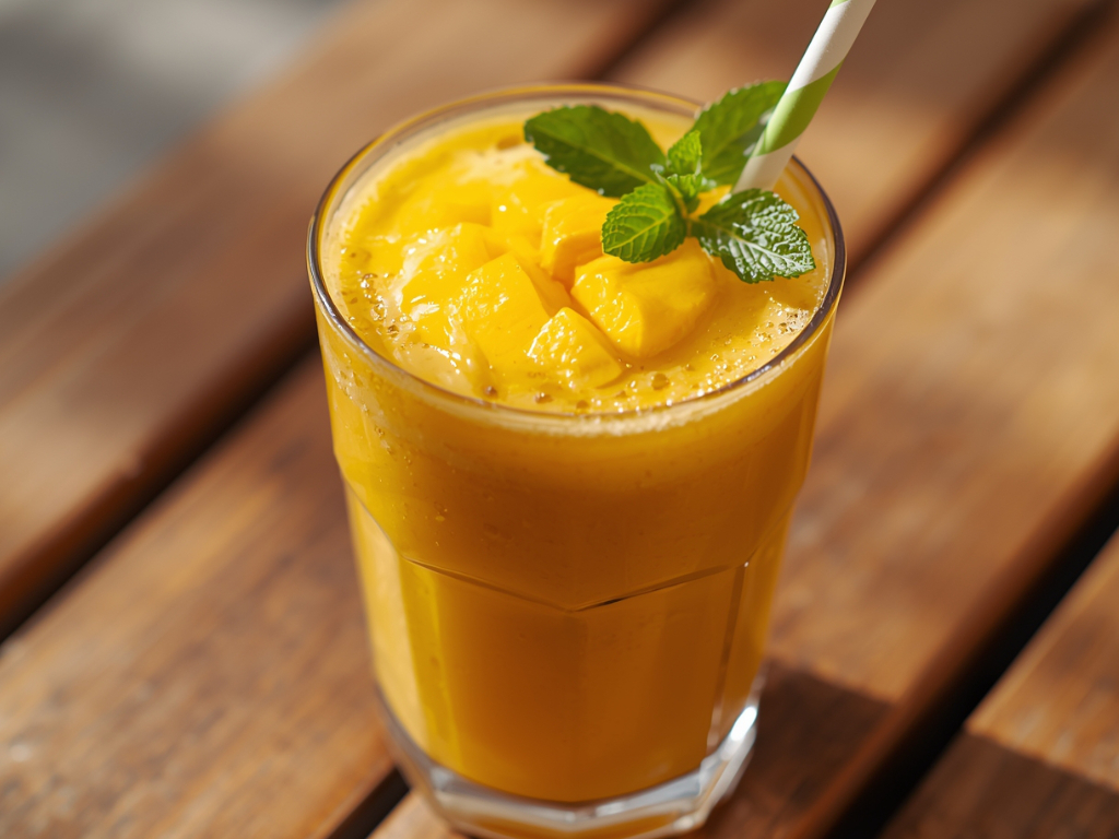 - Serve: Pour the smoothie into glasses and serve immediately. For an extra tropical touch, garnish with a small slice of mango or a mint leaf.