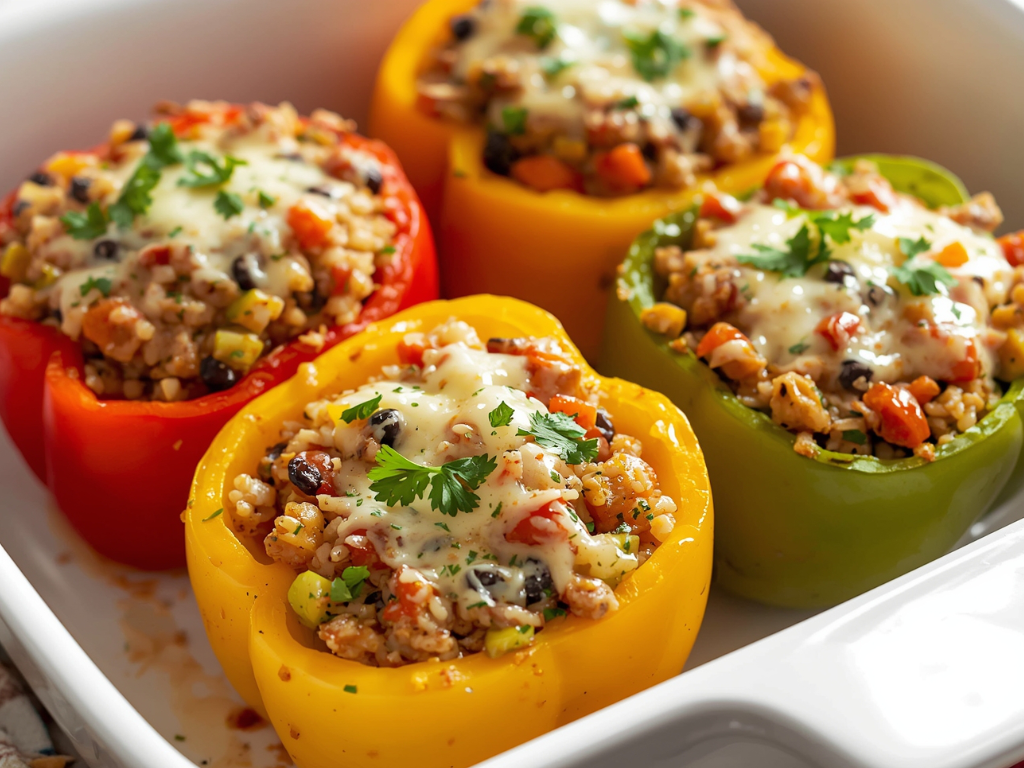 Vegetarian Stuffed Bell Peppers are a hearty, flavorful dinner made with colorful bell peppers filled with a savory mixture of rice, beans, vegetables, and cheese. This wholesome dish is not only nutritious but also comforting and satisfying, making it perfect for a weeknight family dinner. The peppers are baked until tender and topped with melted cheese for a golden, delicious finish.